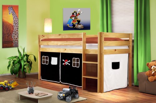 Ⓗ Lit surélevé d'enfants bois de pin massif verni en couleur naturelle - Pirat noir/blanc - SHB/04/1035