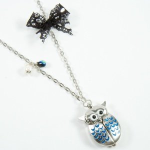 Ⓑ Montre sautoir pendentif style vintage hibou, Crète - - Breloques Avec - Argent fond bleu